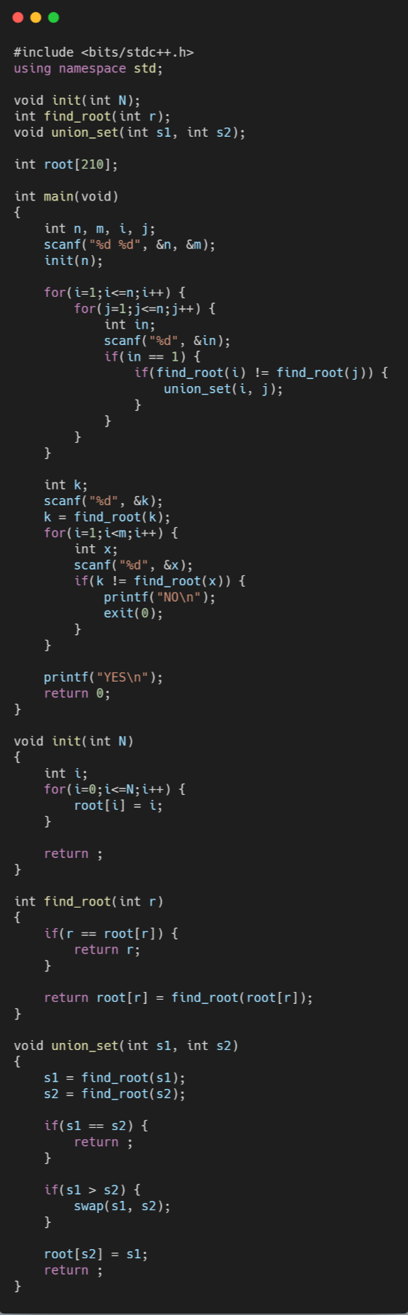 위와 같은 과정을 반복하여 연결 정보를 모두 저장한 후 여행 계획으로 주어지는 도시들의 root를 비교합니다.